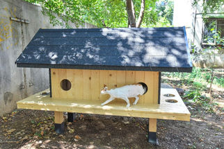 The houses are made of durable materials, weighing 100 kg each, and feature two entrances leading to two separate rooms. These shelters are designed to provide a safe and comfortable refuge for community cats, integrating harmoniously into the urban landscape. Each house is equipped with water and food bowls, thus ensuring the feline's basic needs.
